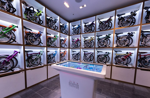 Brompton, marque britannique emblématique de vélos pliants, a ouvert en 2021 un nouveau flagship à Covent Garden. Dans celle-ci, on peut remarquer le rôle premier que joue la communauté pour la marque, le compte Instagram des utilisateurs du vélo britannique apparaissant sur des écrans géants, incarnant ainsi lifestyle de Brompton : permettre de parcourir le monde simplement. De plus, on observe partout valorisation très forte du made in London, que la marque sublime en s’associant à d’autres marques cultes britanniques, telle que Barbour.