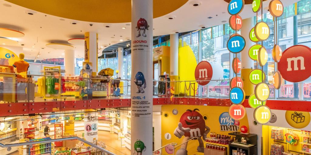 Situé au cœur de Leicester Square, M&M’s World London est le plus grand magasin de bonbons au monde. Réparti sur quatre étages colorés, le magasin regorge d’expériences technologiques pour engager les clients. Tout comme chez Lego, des écrans tactiles numériques et à un photomaton en forme de capsule permettent aux clients de concevoir des messages personnalisés et même imprimer leur propre visage sur leurs M&M’s, au -1 de la boutique.